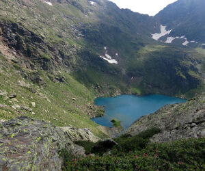 Los primeros minutos el camino va subiendo y bajando en función a la facilidad del camino evitando las grandes rocas y las zonas con más pendiente. Nos encontrábamos en la primera semana de agosto y me sorprendió encontrarme con un buen trozo de nieve en una vertiente del camino con cierta verticalidad. Infundía respeto pero gracias al bastón me permitió cubrir la zona airoso, no sin resbalar un par de veces.