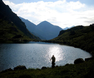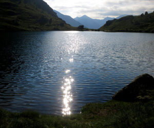 El primer lago nos deja unas maravillosas postales con vistas al este donde podemos contemplar parte de los picos del pirineo catalán en la distancia como el Puigpedrós. Es el más pequeño de los tres y se encuentra a 2.250 metros de altura. A primera hora de la mañana los primeros rayos del sol incidían en las aguas de azul profundo del lago y me encontré con dos pescadores disfrutando de su deporte favorito en un lugar privilegiado.