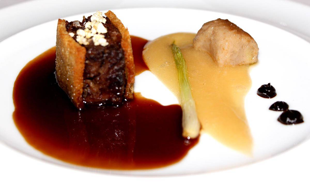 Entre sus platos degustamos unos entrantes muy originales, tartar de gambas, trufas con castañas y crema de espinacas y un estofado de jabalí con castañas.