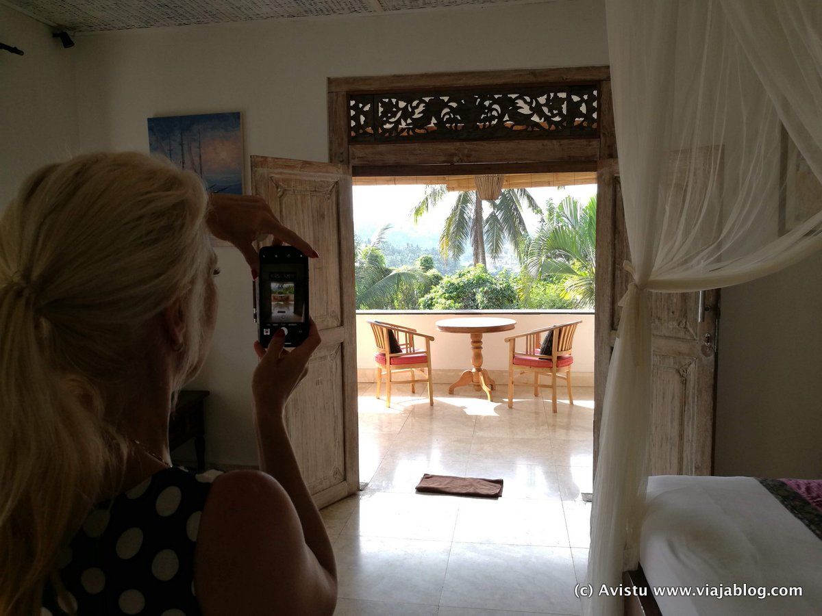 Lo fantástico es que te encuentras en la planta superior de un edificio de sólo dos plantas y una única habitación en cada una, que el acceso es exclusivo para vosotros, que el baño es enorme con una bañera semicircular que le hace justicia, que tenéis una terraza con un gran invento balinés, la “cama de día” para dormir la siesta.