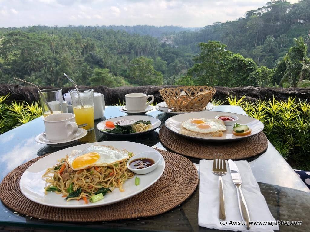 Eso sí, estáis a sólo 5 minutos de la civilización del centro de Ubud, pero mucho más cerca de una piscina infinita (existe la opción de alojarse en una villa con piscina privada), de senderos ajardinados que os llevan a una zona de desayuno donde la comida iguala, de nuevo, a las vistas (aunque vuestros ojos no prestarán mucha atención al plato).