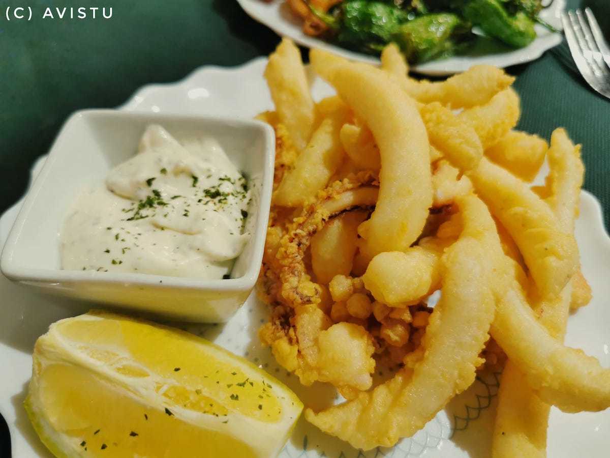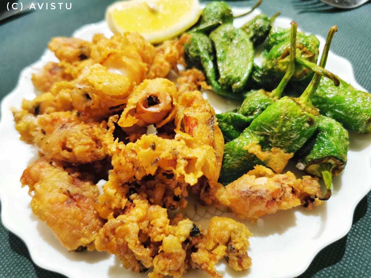 Tiernos «Calamares frescos fritos» («es pescado, tiene que ser sano», me repetía), bien rebozados «Chopitos fritos con pimientos del Padrón» (Es pescado, tiene que ser sano», me repetía), aunque no hubo suerte y no encontramos el que picaba.