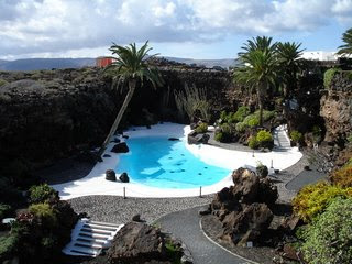 Al llegar al aparcamiento vimos una de las obras del genial arquitecto originario de Lanzarote, César Manrique. Se trata de una escultura de uno de los famosos cangrejos ciegos que pueblan la laguna natural principal del jameo (vocablo aborígen que designa la parte de un tubo volcánico, de la que se ha derrumbado el techo a causa de la acumulación de gases, generando una oquedad circular abierta a la luz). Manrique está muy presente en toda la isla, y no sólo en sus monumentos que se ven aquí y allá mientras conduces por sus carreteras sino que él tiene gran parte de la culpa de que Lanzarote sea tan vírgen como es. Durante toda su vida luchó por un equilibrio entre el arte y la naturaleza queriendo preservar el hábitat donde se crió, modificándolo para realzarlo mediante el arte pero sin dañarlo.