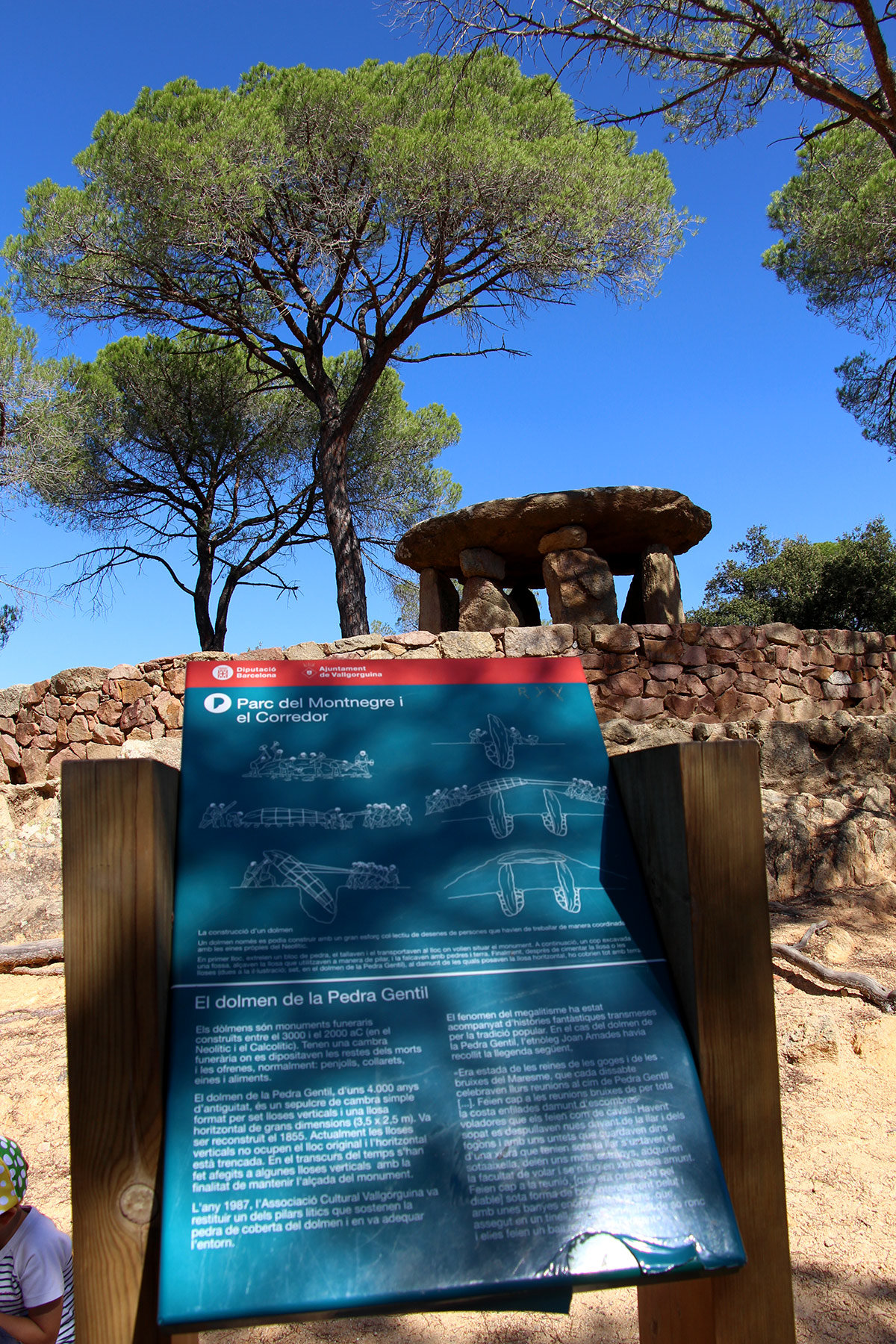 Giramos a la derecha para subir el pequeño monte donde nos espera el Dolmen de Pedra Gentil. Se trata de una cámara simple y tiene una antigüedad de unos 4000 años. Según la tradición este dolmen era el lugar de reunión predilecto para las brujas del Maresme.