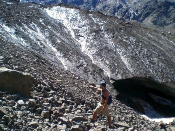 Lo pasamos muy haciendo el cabra y aproximándonos a las cuevas que formaba el glaciar sobre la roca. Un par de ríos de estrecho caudal y congeladas aguas se originaban de estas cuevas y el seguir la ascensión se hacía casi imposible debido a la orografía y composición geológica del terreno. Era todo piedra suelta que te hacía recular uno de cada cuatro pasos.