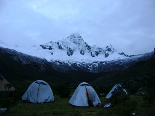 Poco después comíamos riéndonos recordando el episodio. Aún no llovía. Seguimos caminando y se puso a llover. Otras 8 horas de trekking diario y acampamos a los pies del Taullajiru, o éso decía la gente, porque cuando llegamos con la niebla no se veía ni a 100 metros. Cocinamos bajo el techito de la tienda, cenamos y nos pusimos a dormir a las 8 mientras oíamos la lluvia caer. Había varias tiendas más allí, pero con la noche tan buena que hacía no se organizó ni partidita de dominó ni veo, veo ni nada. Así que Casimiro hizo acto de presencia a las 19.59 y todo el mundo a sobarla, o lo que fuera, porque a 4.200 metros y con lluvia hacía un frío de mil demonios y todo el mundo en posición fetal para retener calor en la tienda.