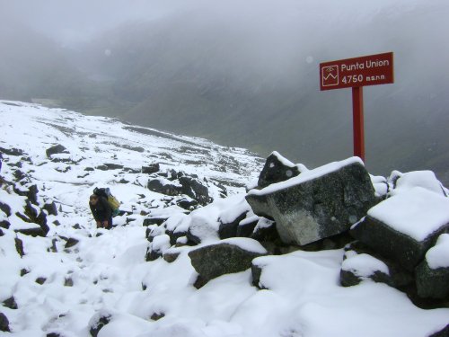 Conseguí dormir algo y a la mañana siguiente salimos a las 6.30 a.m. porque los guías nos dijeron que era la mejor hora para no pillar lluvia en la subida al paso de Punta Unión, a 4750 metros y lugar cumbre del trekking.