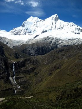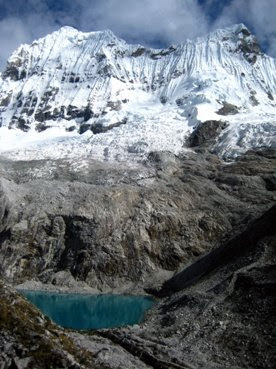 Seguí la senda que parte de Taullipampa en dirección al campamento base del Alpamayo. No pretendía llegar hasta él sino contemplarlo desde una vecina colina y obersvar las vistas. Partí sin mochila y en poco más de media hora (a trote) me encontr´con las paredes de hielo del Alpamayo y el Quilaraju. El nevado Pucajira quedaba escondido y renuncié a seguir más adelante.