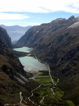 A partir de aquí se inicia un largo descenso no exento de belleza adentrándonos en la quebrada Huaripampa. Lagos y plantas curiosas amenizan el viaje así como los glaciares del Taullajuru a nuestra izquierda.