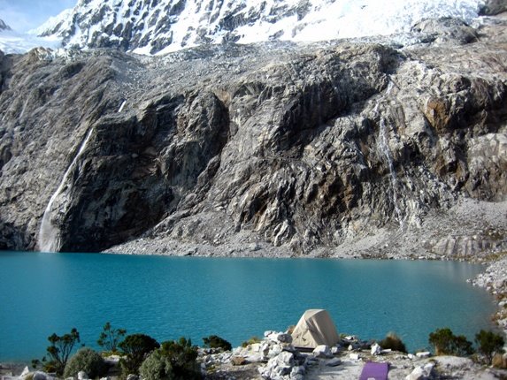 Existen tres campamentos a lo largo del camino. El primero en bajada es el más bonito con los glaciares de la quebrada Paría al fondo y un pequeño lago ante el lugar de acampada. Al pasar no había nadie pero por lo visto en los meses de verano está al completo.