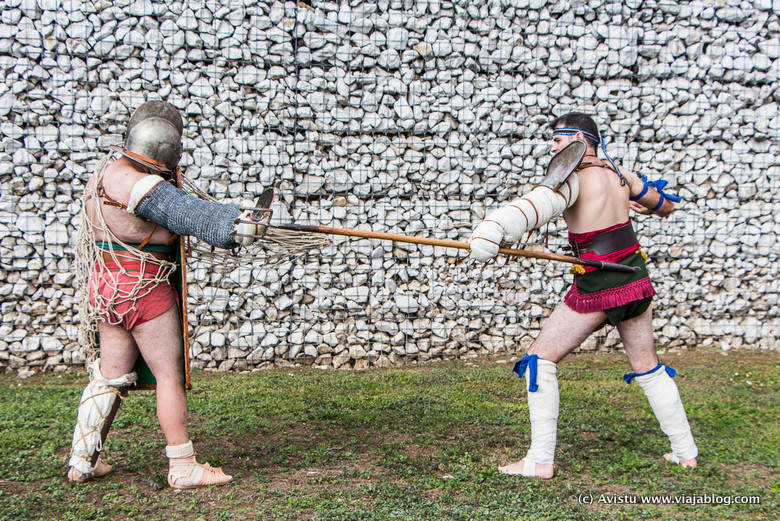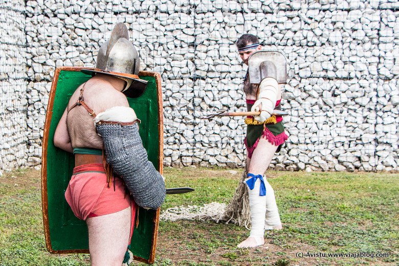 El día de mi visita tuve la oportunidad de viajar en el tiempo a la Roma Imperial (en persona lo hice hace poco), primero con la Asociación Cultural Kérberos, que recreó varios combates entre gladiadores de distintos tipos (con profusas explicaciones sobre ese fascinante mundo), y después con el estómago, gracias al catering de Balbona que nos sirvió platos «al estilo romano». Tenéis más imágenes en la galería de fotos al final del post.
