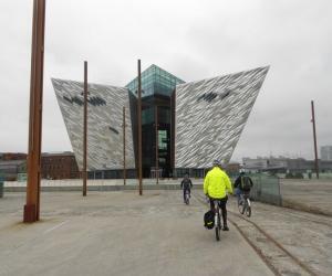 Abandonamos el recinto para dirigirnos de nuevo hacia el río Lagan. Allí embarcamos nuestras bicicletas en el pequeño buque llamado Mona. Su capitán, Derek, era un experto en la ciudad de Belfast, coleccionista amateur de antigüedades y una eminencia en el conocimiento de la historia completa del Titanic. Nos deleító con una gran cantidad de historias sobre los edificios que veíamos, incluyendo la zona del Titanic Quarter, cercana a Queen´s Island, los astilleros donde se construyó el mítico transatlántico que acabó en el fondo del Atlántico en su primer viaje. Ahora es un área con modernos edificios de apartamentos habitados, sobre todo, por jóvenes profesionales.